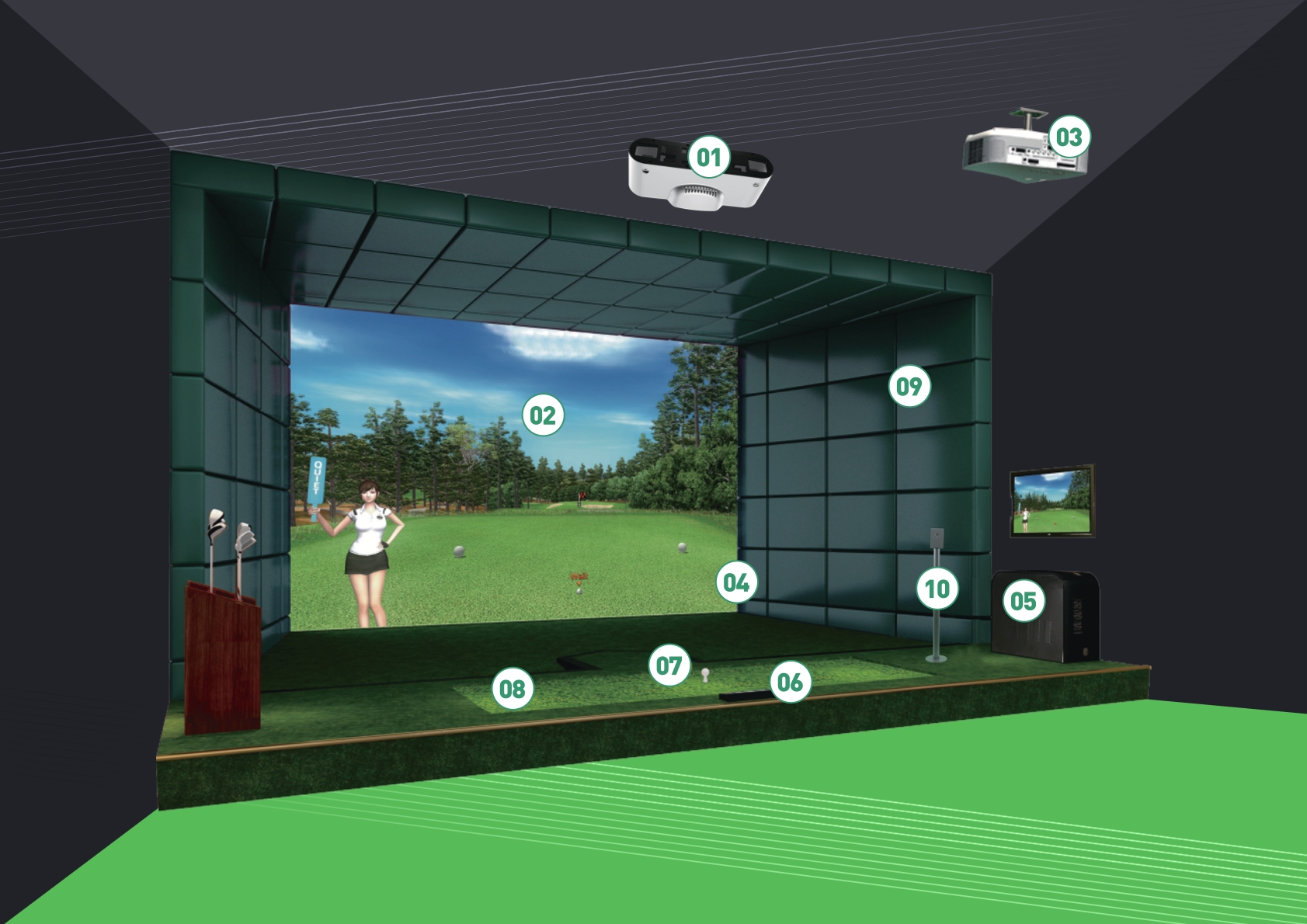 系統可時支持六位球手同時在線使用、分別可設置不同T臺、職業黑T/專業藍T/業余白T/女士紅T根據選手不同水平設置不同級別難易度