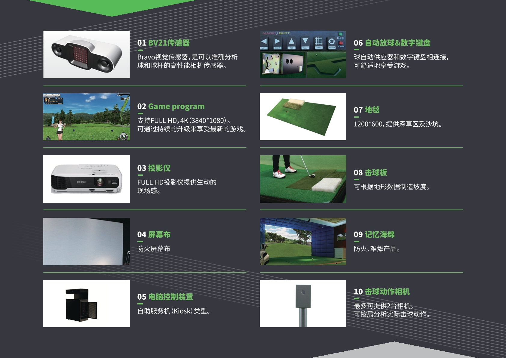 1、超高清模擬高爾夫系統軟件輸出畫面最高分辨率 4K(3840*2160)、軟件內的花草、樹木、水塘、沙坑、山石等障礙均為真是存在與實際球場如出一轍、軟件內置多種開球T(金T、黑T、藍T、百T、紅T)
